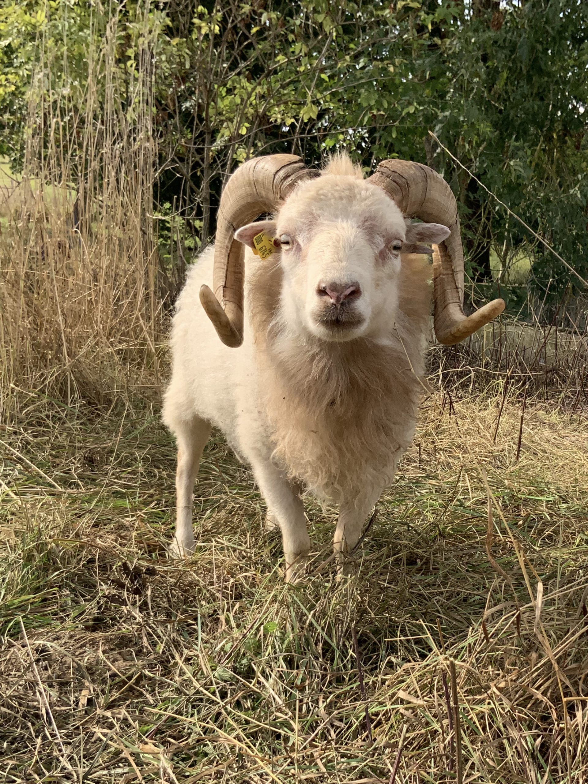 Als ich schließlich Zugriff auf Ovicap hatte, stellte sich außerdem heraus, dass Magnus nicht auf dem Hof der Vorbesitzerin geboren wurde, sondern bereits mehrere Stationen hinter sich hatte und schon so einige Male weitergereicht wurde. All das führte zu einer Entscheidung, die sich für mich richtig anfühlt: Magnus bekommt bei mir einen Platz auf Lebenszeit. Er ist schon ein paar Jahre älter, hat hervorragende Zähne, ein ruhiges Wesen und darf hier ankommen. Wenn ich irgendwann nur noch G1-Tiere habe und ihn nicht mehr in der Zucht einsetzen kann, bleibt er trotzdem. Er wird hier alt werden dürfen – und irgendwann in Rente gehen. Ich hoffe er lernt nach und nach, dass er mir vertrauen kann. Ganz nebenbei üben wir inzwischen auch die Leinenführigkeit. Mit Schafen habe ich darin noch nicht viel Erfahrung, aber wir machen erste Fortschritte. Magnus lernt schnell und trotz aller Skepsis– Leckerlis findet er eigentlich ganz in Ordnung :).